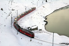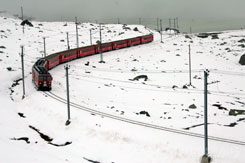 「撮影日誌4」 「晴れていると、天気が悪い時に比べて撮れ高が10倍になる」谷茂岡カメラマンが、みんなの感じていることを言葉にした。季節外れの雪の中を行くベルニナ急行もきれいだったが、雪のきれいさというのは、すべてを白で塗りつぶしたきれいさのようなところがあり、つまり汚いものもキレイなものも全部純白美麗化しているわけだが、スイスのように風景が美しいところでは失うものもまた多し。 ピッツ・ベルニナ、アルプスの日の出も撮れた。ほっとする。 そんなわけで、禁じ手の「二度乗り」をしているベルニナ急行だが、同じ路線という気はほとんどしないので、よしよし、と思う。だが二度目となると、気になるところも出てくる。例えばカーブのきつさ。ベルニナ急行、車両が短いと感じるけど、それは多分この急カーブの連続のためにサイズに限界があるのではないかな。車輪は線路と擦れてキーっと鳴りっぱなしだ。左右に絶え間なくGがかかるために、立ちっぱなしで撮り続けるカメラマンの負担は尋常ではない。通常の車内の数倍のふんばり負担で腰に悪そう。 加えて、考えてしまうのがレーティッシュ鉄道という会社の性格。って、そこまで大げさに言わなくてもよいのだが、このこだわりはどこからくるのか。 ベルニナ急行も、氷河急行のアルブラ川沿いルートも、標高差を克服するためにカーブ、カーブ、またカーブ。まあ、そこまではよいとして、ループも連発。オープンループは特に有名だが、トンネル内でもループやヘアピンあり。撮影していて、方向が分からなくなることは珍しくない。Gを感じながら「ここは左に大きく回っている…多分180度は来たから次は逆に風景が出るな」などと予想を立ててカバーする。 川もジグザグに渡るからトンネル・橋・トンネル直結みたいな場所に何度もでくわす。山国だから当然のことなのかもしれない。でも、例えば、これはすべてラックレールを使わないためにこうなっているのか。あるいは、ラックレールを使ってもやっぱり避けられないのか。ラックレールを使うとどんな問題があるのか。線路保持とか車両整備などのコストは高くなるような気はするけど。あとスピードを出せない?いや、この状態でもスピードを出せるという気はしないなあ。 やっぱり、自分たちの技術力に絶大な自信と誇りがあって、どうしてもそれを世界に示したかったのではないかという結論に傾いていくのだけど。 注:G=《gravity》重力加速度の単位、および記号。宇宙工学などで、 大きな加速度を表すのに用いる。