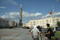 撮影日記6 「ドドーンと、ベラルーシ」 今回は中澤ディレクターに代わって撮影担当の辻智彦が日記を書きます。さて、ベラルーシ。まずは首都のミンスク。旅行ガイドブックなどには「ソビエト・テーマパーク」などと書かれていますが、まさに異世界「鉄のカーテンの向こう側」という感じでした。第二次大戦時、街が徹底的に破壊されたため、戦後ソビエト連邦政府(スターリン!)によって一から造り直された人工都市。街並は、社会主義の理念と意気込みがムンムン漂う暑苦しいほどの整然さです。広すぎる道路、デカすぎる建物、壁に書かれた声高すぎるスローガン。立派すぎる革命の英雄たちの像の数々。圧倒されてしまいます。でもこういう脳みそむき出し的やりすぎな感じが、実は僕のツボにびしっとハマるのです。うーん、なんてイケてるんだ、この街は!などと密かに感動していたところ、助手の佐藤君から「辻さん、なんかイキイキしてますね」と鋭い指摘が。冷静に振る舞っているつもりが、どうやら他のスタッフからは本心が丸見えのようです。中澤ディレクターからも「まったく、可愛いものには反応しないくせに、ドーンとしたものには夢中になるよね」と冷たい視線が。いや、可愛いトイレットペーパーもいいけど、ドーンとした巨大モニュメントなんかも萌えるじゃないですか。ともかく、旧ソ連の他の国々では、ソ連崩壊後これらの街並を、色鮮やかに広告ひしめく資本主義風に変えてきたと思うのですが、この国、ベラルーシだけは別だったようです。90年代初頭のソ連崩壊時、引き倒されるレーニン像なんかの映像をよく見たものですが、ベラルーシではどうやらあまり倒されなかった模様。あちらこちらに巨大なレーニンさんやその他革命の偉いひとたちがドーンと仁王立ちしています。建物もまたデカい!というよりデカく見えます。実は一階一階の天井を高くしたり、直線的なデザインで大きく見せたりと小技を効かせているようなのですが、その建物の意気込みに押され、「ドドーンと撮りたい!」とカメラポジション選びやレンズ選びにもつい熱が入ってしまいました。でも建物もやはりデカいので、撮影位置を変えるたびに延々歩かなければいけません。気がつくと中澤姐さんとエテリーさんは遠くの建物の日陰でお休み、佐藤選手は三脚担いでうんざり顔。さて次回は、中澤ディレクターを襲ったとんでもないアクシデントの真相が明らかに?