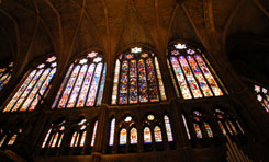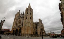 六話> 突然に、冬になりました。 レオンの朝は、15度です。町を行く人がコートを着ています。 そんなわけですから、番組を見た人は「これ、昔、冬に撮影したのを混ぜて放送しているんじゃないの」などと 思わないでくださいね。 しかし、まあ、元々レオンの辺りは、寒いは寒いみたいで、窓が二重になっている建物がたくさんあります。 天気もぱっとしないです。どんよりと曇った空。 うーん、スペイン北部には「水着の上にレインコートを着て行け」などということわざもあるとかで、 本来、雨が多い地方なのだそうです。雨の多いスペインというのも、何だかピンと来ないのですが、 まあ、そういうことです。こういう天気が続くとヤバイよなあ・・・と、 心配しつつも、お天気には勝てない撮影隊なのでありました。 さて、レオンです。 レオンも、中世には羊毛で富を築いた町のひとつだそうです。 そして、ここにも、巨大な大聖堂があります。 ほら、そこ!「また大聖堂かあ」などと落胆しないように レオンの大聖堂は、ちょっと違いますよ。ステンドグラスで世界に名をはせているのです。 「ステンドグラスがすごい、って、まあ、でも、ステンドグラスくらい何処にでもあるんじゃないのぉ?」 などと、油断して訪れた私は正直大変に驚きました。 ステンドグラスだらけ、なんですよ。もう、ずらーっと、ステンドグラスです。 いやあ、一点豪華的なものと違って、空間全体というのは、雰囲気が全然違います。 スペインの大聖堂って、例えばイタリアのような壁や天井が絵画だらけというような 気持ちのよさは、少なくともこれまでなかったですけれども、 ここは、なかなかよいものを見たという気がするわけです。 ここのステンドグラスは、13世紀から20世紀まで、様々な時代に作られたものがあります。 古いものは、さすがに、暗いです。ガラスの不純物が多いためだということです。 もっとも、それが味わいだったりもすると感じますけど。 また、遠いとか、小さいとか、そういう見にくさもあるので、双眼鏡なんぞを持ってくるのが 正解かもしれません。あと、やっぱり見上げつづけるのは、首とか痛くなりますけど。 ステンドグラスに描かれている内容は、もちろん、聖書の様々な場面ですとか、聖人たち、預言者たち、 教皇たち、王族、さらに竜やその他の動物、植物、それから中世の生活を描いたものもあります。 紋章もありました。 あ、紋章で思い出したけど、レオンって、ライオンのことなんですよ。 ライオンと、お城の紋章をよく見かけましたが、これがカスティーリャ・レオンなわけです。 町の中を見渡しても、橋の横にはライオン像があるし、 町のあちこちに、ライオンのロゴマークがあったりします。水道局のマンホールのふたとか。 そういえば、私は初めて知ったのですが、アストゥリアス王国の首都がオビエドからレオンに移って、 レオン王国と呼ばれるようになり、そこからカスティーリャと統一して、カスティーリャ王国が誕生し たのですねえ。 で、どんどん、親国を凌駕して育っていったというわけです。 そういえば、スペインの中世に興味を持つには大変によいマンガがあります。 アルカサル −王城― (青池保子作) 12巻で完成していないのですけど…。 それって、多分主人公が最後には負けちゃうからじゃないのかなあ。 内容は、14世紀、ペドロ1世とエンリケ2世との争いを中心にした物語で、 アラゴン王ペドロ4世や、ポルトガル王ペドロ、えーっと、何世だっけ。 どうして皆、ペドロなのだろうか…。 と、まあ、そういうことです。 カスティーリャは内戦になり、アラゴンとも戦争が続き、グラナダが離反したりしまして。 だから、ソリアに侵攻、とか、シグエンサに幽閉とか、 ブルゴスで会議とか、カラタユーが陥落とか(適当に書いてます)、今回旅した場所が ページをめくると、あちこちに散らばっておりまする。 それにしても、まあ、三国志とか中国歴史ものを読んでいてもそうですし、 イギリスなんかも、そうなんですけど、スペインも激しく裏切りやら暗殺やらが続きますねえ。 どういう利害の計算の上に裏切りは成り立っているのだろうか。 だってね、一応、現在でも自分は貴族で領主様なんですよ。 まあ、いいじゃないですか。それで普通にやっていても。 というのは、敵方と内通した場合のリスクを考えてみると…。 1.内通がバレて死刑。 2.内通はバレないまま戦争に突入したものの、結局負けてしまって戦死又は死刑。 3.戦争には勝ったものの、戦死。 4.戦争には勝ったものの、結局新王が裏切って褒美をくれない、又は死刑。 これほどの危険を冒してまで、より広い領土、より高い身分が欲しいのかなあ。 しかし、一方で、「契約書」が厳しいですよね。日本の中世がどうだったのか、よく知りませんが。 スペインでは、何かというと、やはり、契約だし、ルールだし、王様だし、 というあたりが、興味深いところでもあ