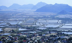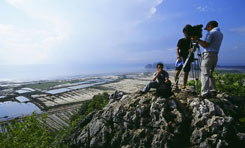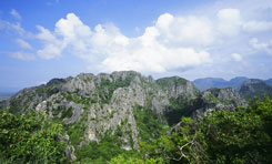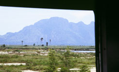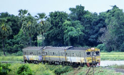 タイ撮影日誌7 クラ地峡、というのですよ。この細長く伸びた半島の細い部分のことですけど。英語だとIsthmus of Kra。このisthmusという単語は、何だか格好よくないですか。ラテン語系だと思うけど。で、ここの最狭部(幅僅か64km!)付近に運河を通すという計画があったそうです。ここに運河があれば、船は難所と云われるマラッカ海峡を通る必要もなくなるし。近道だし。ということは、今日に至るシンガポールの繁栄もなかったかもしれません。代りにプラチャップ・キリ・カーンとかチュンポンあたりが、大貿易港として栄えていたとか?タイの国土の一番“狭い”ところは、バン・ワン・ドゥアンという町の付近のようで、駅のホームの端っこに、その旨が小さく表示がされておりました。 南に来ているからなのか、太陽は強烈。手元の温度計では、気温は40度です。コントラストがやや強すぎて、緑が黒っぽく映ってしまいます。逆に光が当たっている部分は、明るすぎて真っ白です。風景全体が、それぞれの色で発光しているみたいな、色の濃い世界です。遠くに見える海は青く光り、植えられたばかりの苗は淡い緑に光り、大きなヤシの木は深い緑で、光沢のある葉がキラキラ光っています。幾つもの川や水田の水が、さらにキラキラ感を加えています。やっぱり多いのは水田で、その向こうに岩山があるというのが、代表的な景観です。 どんな岩山なのか、近くでじっくりチェックする必要があると思い、カオ・サム・ロイ・ヨー国立公園にも寄りました。朝6時にホテルを出て、何も食べずに公園まで行き、レンジャーに引率されて、いきなり登山!?朝とは言え、当然気温も湿度も日本の真夏ですから、ふらふらになります。石灰岩のゴツゴツした岩山は、水墨画向きかもしれません。お寺と組み合わせれば、大変によろしいかも。石灰岩って、どうして、まるで研いだように、鋭利な表面になるんでしょうね。うっかり角に引っかけたりすると、ズボンやリュックがキレイに裂けます。 国立公園から駅へと車を飛ばして、列車を待つ僅かな時間に、駅で買ったお弁当を掻っ込みます。ホアヒンから、終点ランスアンまでは6時間。長い一日。テープもたくさん回ることでしょう。 もし、時刻表でこの旅程をチェックしようという方が、いらっしゃいましたら。実は、英語版の時刻表には出ていない列車というのが、幾つかありまして、ランスアン行もその一本なのです。三等車の旅を楽しみたい方には、タイ語の時刻表をオススメします。