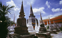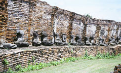 タイ撮影日誌2 バンコクからアユタヤを結ぶ路線は、タイ国鉄として最初に建設された部分で、1894年に運行を開始したところです。旧首都へ。そこに何か、特別な思い入れがあったのでしょうか。チェンマイまで鉄道が到達したのは、その32年後。それにしても、タイの鉄道って、どういう立場なのかなあ。まあ、チェンマイまで、飛行機でも数千円で行けるのに、鉄道を使うというのは、それは、やっぱり安いからなんでしょうけどね。運賃だけだとバンコク〜チェンマイって140バーツ(420円)で行けるようですから。その運賃って東京〜三鷹くらいかな?もちろん、急行などになると、料金が加算されていきます。 そんなわけで、今回はもっぱら三等に乗車している私たち。でも、結構快適です。窓が開いていれば、車内の暑さもそれほどではないし、リクライニングしない対面シート(少し前までは日本にもありましたよね)も悪くないです。揺れは、なかなか激しいものがありますけど。列車からの風景は、もっぱら水田です。こうして見ると、タイは広いですねえ。日本の1.4倍だということですが。 乗客は、やっぱり何というか、観光という感じの人はほとんどいません。商売その他、用があるから移動するわけで、風景なんぞにウツツを抜かしている場合じゃない、というような雰囲気の人が多いです。大きな荷物を持った人(これまた、少し前の日本でも珍しくない光景でしたが)も大勢いますし。床にずらーっと置かれたその荷物から、いもいわれぬかぐわしい魚醤的芳香が車中にただよっていたりもします。これはちょっと嫌です。そうそう。タイの人たちは、座席の上にあぐらをかいて座る人が非常に多いです。元々、裸足にサンダルという足回りなので、ひょい、とそのまま。 ところで、突然ですが、遺跡というのは、遺跡になってからの方がいいんですかねえ。いや、例えばアユタヤに来てみて、そりゃあ、この街の全盛期はどれほどすごかったか、それも非常に興味をそそるところですが。これらの寺院がピカピカで現役で、街に活気が溢れ、様々な民族の人々が行き交うというのも、想像すると素敵ですけどねえ。しかし、まあ、この崩れかけた赤茶色のレンガの遺跡になっている「よさ」というのもあるわけで。首を落とされた仏像がずらーっと並んでいるから、インパクトがあったりするわけじゃないですか。それとも、これって、単に私たちがワビサビ文化圏の出身だから、そう感じるだけ?