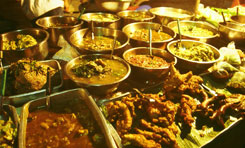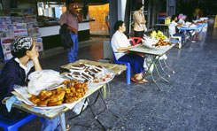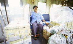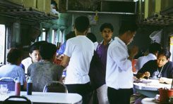タイ撮影日誌3 タイで食べるタイ料理は東京よりも断然美味しく感じます。基本的な材料が揃っているからかもしれませんが。辛さ、甘さ、酸っぱさ、そして、バジルやレモングラスやコブミカンやパクチーや干しエビや、ライムや、その他何が入っているのか詳しくは判りませんけど、全ての味や香りが、ずっと鮮烈で、複雑に感じられます。そして、あの気候!あの暑さの中で労働した後に食べるには、何だかあの塩分、糖分、ビタミンC含有量と、食欲を増進させる辛さの組み合わせが非常に合理的に思えたりもするし。 関係ないけど、タイの人は、食べ物をよく混ぜますね。例えばゴハンに何かのオカズがかかっているようなものだと、一口食べる度にしばらく混ぜていました。麺の具でさえも、スープをよりよく絡ませるためでしょうか、混ぜる混ぜる。日本人だと、せっかちだからか、ゴハンの上にオカズをポンと乗せたら、そのまま口に運んでパクリという感じじゃないですか。丼ものを食べる時も、別にぐちゃぐちゃに混ぜないですよねえ。むしろぐちゃぐちゃ的食感を嫌う傾向が強いと思います。 さて、そんなわけで、旅で最も大切な要素のひとつ、食事ですが。今回は各駅停車に乗っていたので、食堂車がありません。数時間乗り続けているので、食事は重大問題です。少し大きな駅には、それぞれ食堂や、屋台や、お弁当屋さんがあります。まあ、停車時間との兼ね合いですが。そして、各駅停車だからかどうか、車内販売も盛んです。時として、乗客よりも、売り手の方が大勢いたりすることすらあります。売っているのは、お弁当、お菓子、フルーツ、タピオカ、焼き鳥、フライドチキン、飲み物など。地域によっても違います。 そういえば、バンコクでは日本食ブームなんだそうですよ。日本食、まず、「低カロリーでヘルシー」。加えて、「緑茶には様々な健康的効能がある」。さらに、辛いもの好きなタイの嗜好を刺激してやまない「ワサビの新鮮な辛さ」、ということだそうです。ここで注目してしまうのは、やはり、「低カロリーでヘルシー」という部分ですよねー。アメリカ人が、そういうことを言うのには驚かないけど、まことに失礼ながら、その、タイでも「カロリー」とか、「ヘルシー」とか、さらに付け加えれば、暗に「太るのは悪」「成人病に注意」「腹一杯食べてはいけない」「肉より魚」というようなことを意識する時代に突入していることは、少々感慨深いものがありました。