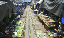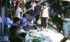 タイ撮影日誌5 北本線に続いては、メークロン線に乗車します。メークロン線というのは、バンコクのトンブリ地区から、南西方向に、サムット・ソンクラーム(水上マーケットで有名なダムノン・サドアクのやや近く)まで走っているローカル線です。バンコクの普通の通勤列車、という感じの鉄道です。この鉄道、初めはザビエルさんという、ポルトガル人が興したようですけどね。後に国営化されました。1904年に開業したというから、相当古いですよねえ。東京近郊だと、中央線の新宿・立川間が1889年開通らしいので、その差僅かに15年…。ふーむ。いえ、どうしてそんなことが気になるかというとですね、中央線の周辺は相当栄えているじゃないですか。駅前なんてどこも立派なものです。ところがメークロン線、駅前が栄えていません。いや、それは言い過ぎかもしれないですけど、でも、栄えてないよなあ。日本のように、どんどん郊外住宅ができて、駅前商店街ができて、スーパーができて、銀行ができて、という展開をしなかったんですねえ。日本が特殊なのかなあ。 そして、メークロン線は、川によって分断されています。終点メークロン駅まで行くには、途中、渡し舟で川を渡らなければなりません。私の勝手な想像ですが、鉄橋を作るのが大変すぎるので、これで妥協したのでありましょう。それなのに!何と!この線を複線化、電化、高速鉄道化するという計画もあるそうなのですよ。だから、このローカル丸出しな雰囲気も、20年後には全く無くなって、それこそ駅前商店街になっているのやもしれませぬ。 「駅前」ならぬ「線路上商店街」とでも呼ぶべきものは、あったりします。これにはビックリ!それにしても、タイの鉄道の敷地というのは、どういう扱いなんでしょうねえ。タイでは、駅は通り道。駅を渡って向こう側に行きます。それは、「連絡通路」ということではなくて、単に線路を突っ切る、或いは、停車している列車のドアから入って、反対側から抜けて行く、というような通り方です。他にも、線路を道路のように歩く人々が、ぞろぞろいるのはもちろん、線路上に店まで出ているというのは、どういうことなんでしょうか?鉄道と契約があって、その線路上の土地一日幾らの賃貸契約があるのでしょうか?それとも、その土地の元々の所有者一族で、鉄道が敷かれた時に子々孫々まで、その土地で商売する権利を保障するという一筆があるのでしょうか。考えすぎかな?