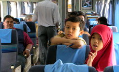 マレーシア撮影日誌4 クアラ・リピスを過ぎると、風景が変わり、岩山が次々と現れるようになります。切り立った石灰岩の崖。そこここに、穴が開いてます。そして、何故か木もいっぱい生えている。あんな岩の上にどうやって? こんな岩山のふもとに、グアムサンの駅があります。日没直後、まだ空が明るい間に到着することができました。グアとは「洞窟」という意味で、「ムサン」はジャコウネコのような動物のことらしい。 翌朝、グアムサンから7時の出発。 駅前の食堂では、鉄道の人たちを中心に朝食中。紫色(暗いので本当は何色なのかよく見えない)に色をつけたゴハンに、魚のフレークのようなものをかけ、さらにカレーをかけ、焼いたチキンを一切れのせる。ゴハンに色をつけるのには理由があって、元々はゴハンではなかったらしい。何かの木の実だったのだそうです。で、その色が、その紫チックな色だった、というわけで、それを再現しているのですね。 このグアムサン駅には、何故か大きな水槽があって、コイに似た魚が飼われていました。駅長の趣味か?ここから乗った客は、10名足らず。大変に心配な出発でしたが、途中から乗客が増えてきて、安心しました。 マレーシアの北東部、ケランタン州は、マレー文化の中心で、非常に保守的な地域なのだそうです。文化的にも政治的にも、他の州とは一線を画する存在らしい。マハティール元首相が、なかなかこの州だけには勝てなかったという話も聞きました。そんなわけで、ここには、マレーの伝統の一部である、凧揚げや、コマ競技、大太鼓祭りなどが脈々と生きているということです。ケランタン州の中心が、コタバルという町ですが、大手国際チェーンのホテルのレストランでも酒類がないという、徹底ぶりです。 ジャングル列車の終点は、トゥンパッ。海が近いのですが、残念ながら期待していたほど美しいビーチというわけには行きませんでした。タイ国境の近くまで戻って来たからか、全長40メートルという、巨大な涅槃仏像のある寺院があり、また、これまで見慣れたヤシやゴムではなく、水田が広がっています。そうそう。実は、この 東海岸線からタイ側にも線路はつながっているらしい。でも、現在は、残念ながら国境を越えて走る旅客鉄道はありません。 ジャングル列車の旅が終わり、残すは最後の、ゲマス〜シンガポール間だけになりました。二度目の国境越えが、このロケの最後のイベントになるのかな。