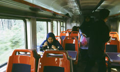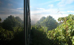 マレーシア撮影日誌3 「ジャングル・トレイン」という呼び名とは裏腹に、ジャングルのない車窓の風景。やっぱり鉄道が通った以上は、どんどん開発されるのが当然なのでしょうか。 朝、ゲマス駅からの出発。昨夜は大雨でしたが、とりあえず、今朝は快晴。太陽が昇るとこが見られました。 ゲマス駅から、北に向かって出発。内陸部、山の間を走っていく車窓には、小さな村が点在し、線路の周りには、ゴム、ヤシ、バナナの木が続きます。左手には、2000メートルを超える山々があるのですが、雲が低くてほとんど見ることはできません。 さて、マレーシアに入ってからの、これまでの列車と比べると、とてもオンボロな今回の列車なのですが、それでも冷房車があります。冷房車、非冷房車、そして食堂車もあります。当然、冷房車が先に混んできます。途中の駅で、客は徐々に増えてきます。タマン・ネガラ国立公園から東海岸の島々に向かう外国人の旅行者、なども乗ってきました。タイ以来久しぶりの暑くてうるさい列車は、楽しいです。 ところがゲマスからおよそ5時間半、クアラ・リピスで事件発生。何故か、私たちの列車より9時間以上も前に通過しているはずの、急行列車が停まっています。9時間遅れって、どういうこと?と詳しく聞けば、この先のグアムサンの近くで昨夜遅く脱線事故があったとのこと。脱線?タイに続いてここでも脱線?と、それはいいとして、復旧の見通しは?何でも、脱線によって10キロほどの線路が破損し、昨夜から徹夜で工事しているということです。でも、10キロ?しかも山奥だし。何日もかかりそうな予感。このままロケ続行できるのか?という割には、ほとんどの乗客は特に焦る様子もないんですよねえ。慣れっこ?やきもきしながら待つこと2時間。急行列車の方から、発車するという知らせが入りました!突貫工事で10キロ直したんですね。やるな、マレーシア国鉄。知らせを受けて、大勢の乗客が急行列車に移動します。我々の分の席はありませんが、まあ、どうせ撮影しているから、関係ないし。これで何とか、旅を続けて行けます。 脱線現場付近では、工事を終えたばかりの人たちが、最初の列車の通過を見守っていました。乗客たちも、窓に張り付いて、心配そうに見ています。列車は最徐行。線路の下に敷かれた、真っ白な石のために、工事した箇所はすぐに判ります。まったく問題なく列車は通過することができました。再びスピードを上げて、グアムサンに向かいます。