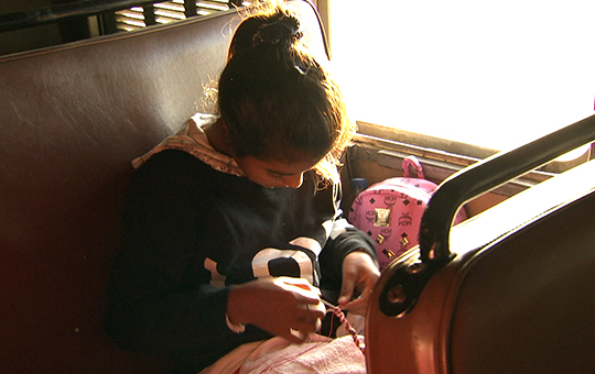 車内を歩いていると、朝日に照らされる中、一人、ミサンガを編んでいる少女を発見した。彼女の名前はフリエタちゃん。年齢は12歳。「始発駅から終点まで乗る」「編み始めたのは出発した昨晩」「お母さんと弟は横の座席でまだ寝ている」など、一通り話を聞き撮影をさせてもらった。(ちなみに、アルゼンチンでミサンガは「ポルセーラ」と呼ばれていて、日本のように何かを願掛けしたりする習慣はないらしい。)