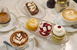 そして、この日の取材のメインはカフェの撮影!メルボルンといえば、カフェ文化が有名。1950年代以降、イタリアからの移民が多くやってきてからカフェ文化が広まったらしい。確かに、見かけるカフェはどこも大繁盛で、お客さんたちも楽しそう。取材をしたのは、フリンダース・ストリート駅からすぐの路地にあるクラシックなカフェ“デグレーブス・エスプレッソ・バー”。町の中心にできた最初のカフェのひとつだ。さっそく定番のコーヒーとカフェラテを注文。カフェラテは、ラテアートを描くところから撮影させてもらった。あっという間に美しいラテアートが完成!世界屈指のコーヒー文化都市と呼ばれるこの街のバリスタ技術を間近に見ることができて感動した。撮影を終えたらさっそく味を確認。頂いたコーヒーは、酸味強め。オーダーしたもの以外にも植物性のミルクを使ったカフェメニューもあり、バリエーション豊か。それぞれの好みを追求できるのがこの街のカフェの魅力なのかもしれない。