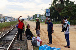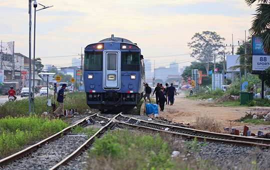 プノンペン駅を出発する列車は、1日のあいだに、北線・南線それぞれ朝の1便のみ。列車が折り返してプノンペンへ戻るのは夜になるので、日中に町中を走っている列車の姿を撮るこのチャンスには自然と重みが出てきます。