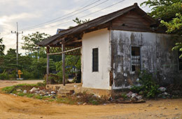 6:40に北線、7:00に南線がプノンペン駅を出発して、その10〜15分後くらいにここを通過するはず。私以外の4人が、撮影位置を探りに車で移動していた頃、私は線路の脇でカメラ番をしていました。線路を走る犬を眺めたりしてぼんやりしていると、なぜだか人が一人二人とやってきました。いったい何の用があるのだろう…?にこやかな青年が話しかけてきたので翻訳アプリで会話してみると、バッタンバンの家に帰るらしく、「今日人生初めて列車に乗るんだ」と言います。それなら駅はもっと向こうでは?ここでは乗れないんじゃない?と言ってもうまく通じません。もしかして、ここから乗るんだろうか。駅舎もホームもないというのに。ソティさんが戻ってきたので、集まっていた人々に話を聞いてもらうとやはりここが乗り場でした。背後にあったボロボロの建物を指して、かつて使われていた駅舎だと教えてくれました。