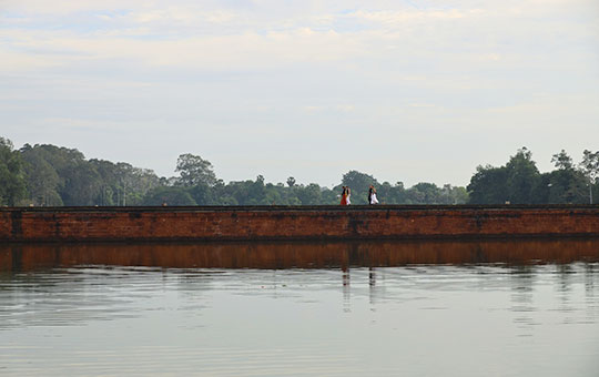 - 水面に浮かぶように見えるアンコール・ワットの西参道