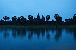 アンコール遺跡の撮影に徹する7月下旬のある日。まずは「朝日を背負うアンコール・ワット」を撮りに、5時前には西参道の聖池前へ行って場所取りを完了させました。日の出は5時47分。空模様は曇り。残念ながら今日は太陽が出そうにありません。しかし空が段々と青みがかり、雨が降ってきて、輪郭をはっきりと見せ始めたそれは、しっとりと陰りがあり、厳かなオーラがありました。