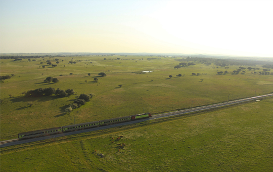 - ドロウ川を上流へ辿る列車では、雲の隙間から強い一筋の光が川に差し、水面が輝いた瞬間が印象的だった。そして今この時、目の前に広がるアレンテージョの平原は、ねっとりと熱いエネルギーを持ったオレンジ色に染まっている。田舎で休暇を過ごし、リスボンへ帰る人たち。言葉数は少なく、お気に入りの曲に乗せて、どこまでも続く大平原の景色を見つめている様だ。列車の旅。それは天気、車窓の風景、乗客の思い、すべてが移ろいゆくということなのだ。