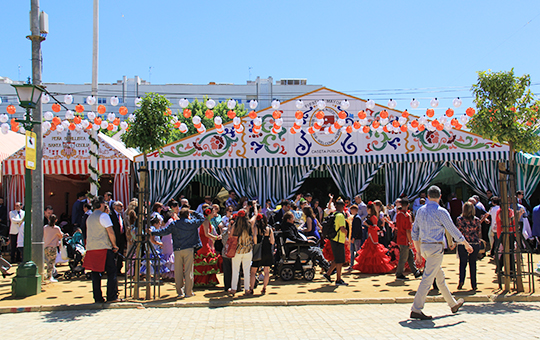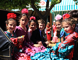 セビーリャの街はフェリア・デ・アブリル(春祭り)の期間中、華やかな雰囲気に包まれる。何より目立つのは、フラメンコの衣装として知られる伝統のドレスを纏った女性たち。背中が大きく開いた細身のドレスを、どの世代の人も素敵に着こなしている。男性もスーツや伝統の衣装をきちっと着ていて、装いを見ただけで祭りにかける思いの強さがひしひしと伝わってくる。
