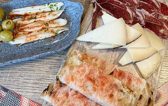 中でも毎日のように食べているのが、スペインのサンドウィッチ“ボカディージョ”だ。バゲットに肉や野菜、チーズなど様々な具をはさみ、オリーブオイルをかける定番のメニューで、どこのカフェやバルにもある。撮影の合間に手軽に食べられて助かるのだが、少し困るのがあまりに巨大なこと。特に地元の人向けの食堂では、長さ30センチはあろうかというパンに、具がぎっしりはさまれ、軽く二食分はありそうだ。初めは驚いていたのだが、次第に慣れて食べきれるようになってしまった。列車では、家からパンと数種類の具を持参し、その場で作って食べ始める人もいた。携帯ボトルに入れたオリーブオイルをかけて、作り立てのボカディージョを美味しそうに食べる姿に、並々ならぬ食へのこだわりを感じた。