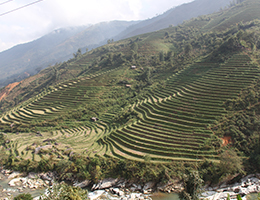 - ハノイから北へと列車の旅を続ける。中国との国境の街ラオカイへは寝台車。北部はベトナム最高峰を擁する山岳地帯で、外国人観光客に人気が高い。ここまで味わうことのなかった、高原の光と空気が新鮮で心地よい。周辺ではモン族(生活圏は中越国境を跨いでおり中国側ではミャオ族と呼ばれる)など少数民族の人々の姿も大勢見ることができた。独特の民族衣装は魅力的だし、急斜面に拓かれた棚田は美しく、郷愁を誘う。