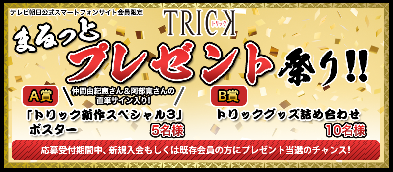 スマートフォン会員の方限定!なんと、仲間由紀恵さん&阿部寛さんの直筆サイン入りポスターや、トリックグッズの詰め合わせが当たるプレンゼントキャンペーン!