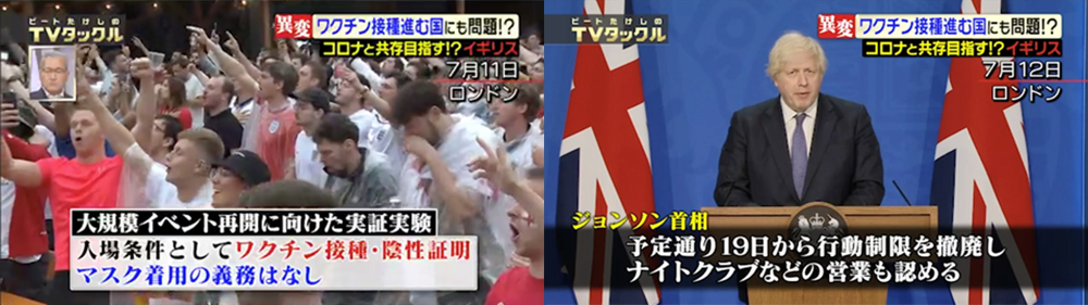そんな中、イギリス政府は「大規模イベント再開に向けた実証実験」としサッカーヨーロッパ選手権の決勝戦で6万人を超える観客をスタジアムに入れることを許可。入場の条件として、ワクチン接種などを求めたがマスクの着用は義務づけなかった。