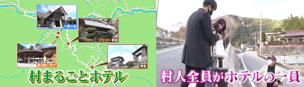 ホテル従業員は村民、村の案内人も村民、村全体をホテルにした「村まるごとホテル」を始動。その結果、観光客も移住者も増加したという。