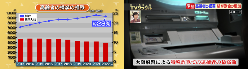近年、高齢者の検挙人員は減っているものの検挙全体における高齢者の割合は増加傾向にあり20%を超える。今年2月にはSNSで闇バイトを知り「受け子」をした84歳の男が逮捕された