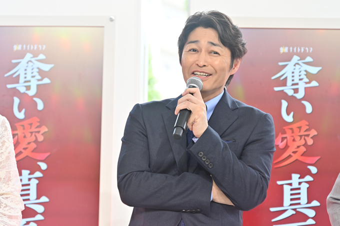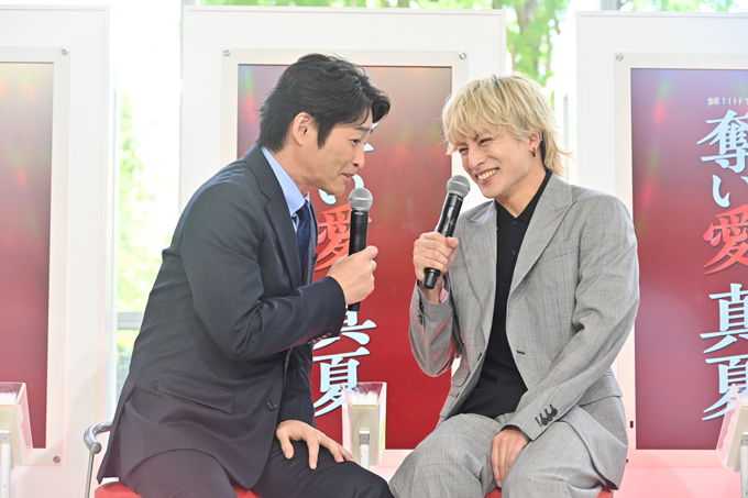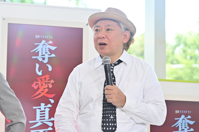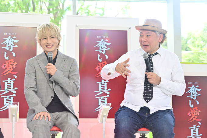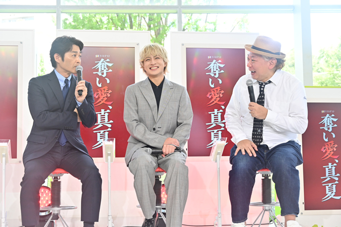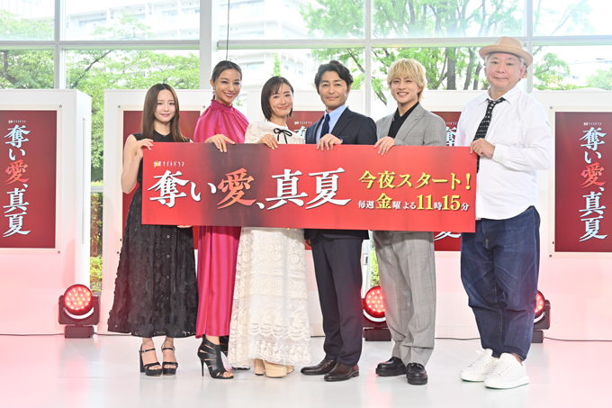 本日7月18日(金)、ついに開幕する令和7年の『奪い愛』。待望の初回放送を数時間後に控える中、テレビ朝日本社1階のサマフェスサブステージで、制作発表記者会見を開催! 図らずも禁断の愛に身を投じていく真夏&時夢を演じる松本まりかと安田顕、時夢を愛するセレブ育ちの妻・空知未来(そらち・みらい)役の高橋メアリージュン、真夏を一途に想う元部下・日熊元也(ひのくま・げんや)役の白濱亜嵐、未来の妹で自由奔放な炎上仕掛け人・山上花火(やまうえ・はなび)役の森香澄、そして『奪い愛』シリーズの生みの親で脚本を担当する鈴木おさむが登壇しました。
