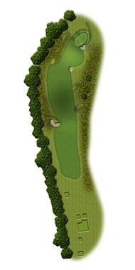 ティーショットが鍵になるミドルホール ロングヒッターは下り傾斜を利用してランを出すことができるが、左のバンカーは避けないといけない。 グリーンは受けており、アプローチはしやすい。