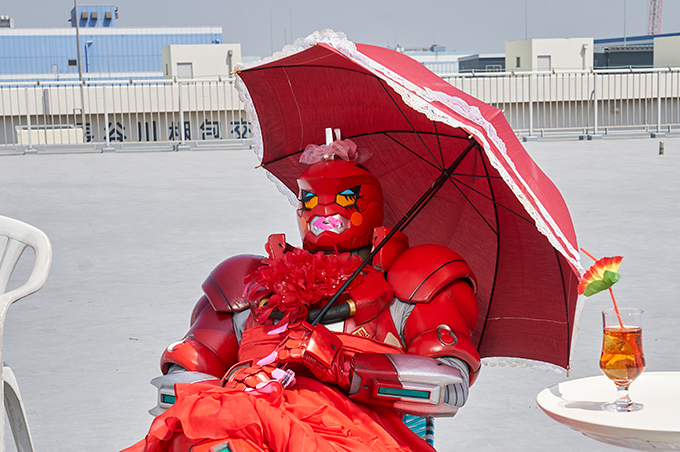ジュラ子は日焼けが気になっちゃう。真っ赤な日傘は欠かせないわっ。